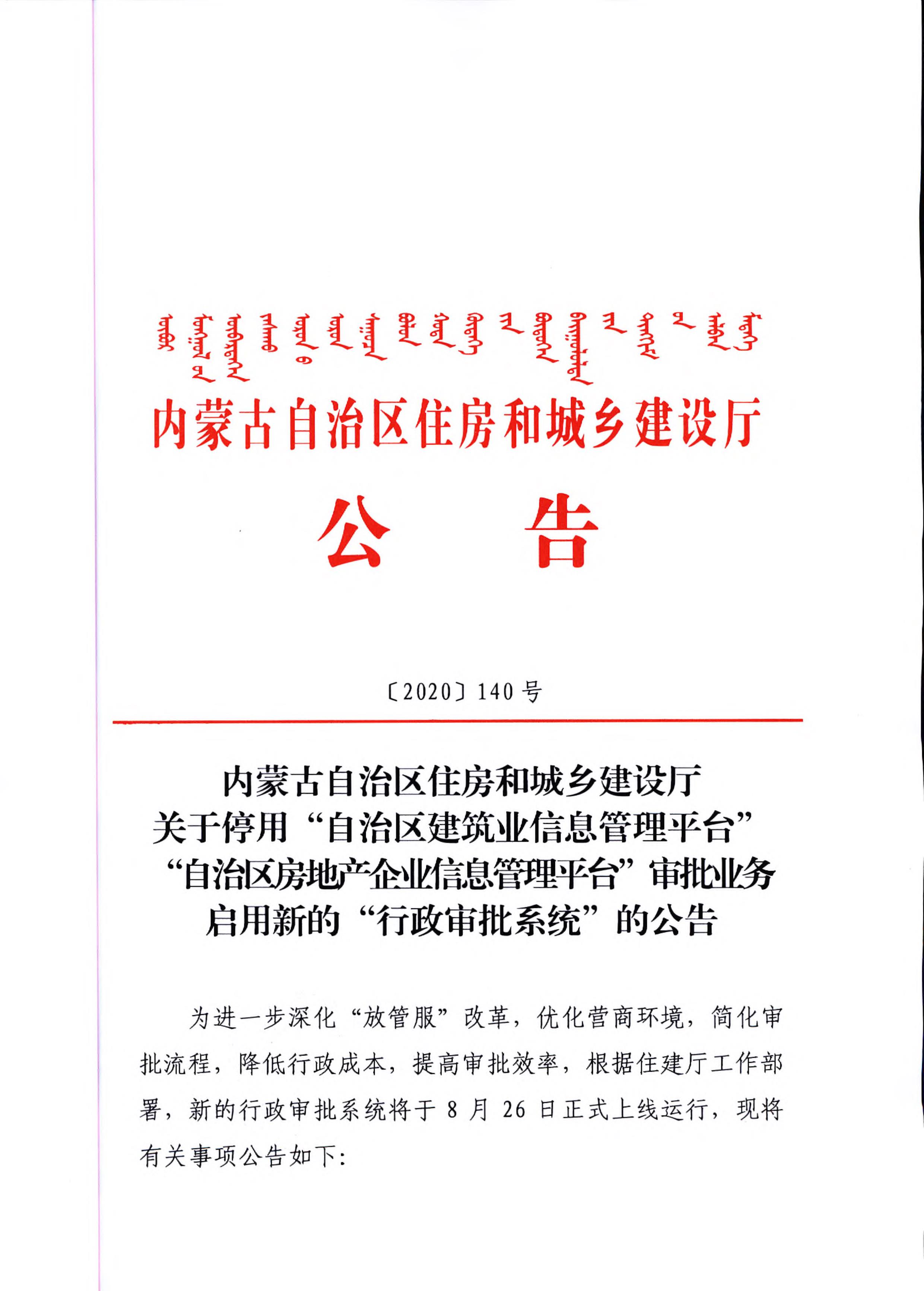 內蒙古自治區(qū)住房和城鄉(xiāng)建設廳關于停用“自治區(qū)建筑業(yè)信息管理平臺”“自治區(qū)房地產企業(yè)信息管理平臺”審批業(yè)務啟用新的“行政審批系統(tǒng)”的公告