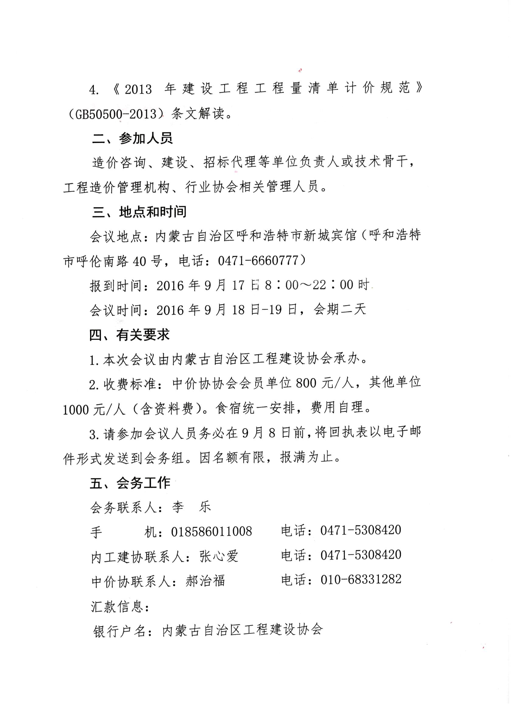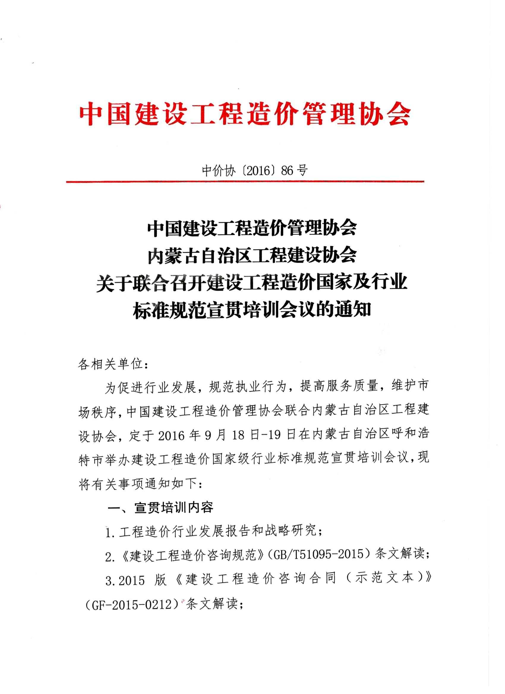 中國建設工程造價管理協(xié)會 內(nèi)蒙古自治區(qū)工程建設協(xié)會 關于聯(lián)合召開建設工程造價國家及行業(yè) 標準規(guī)范宣貫培訓會議的通知